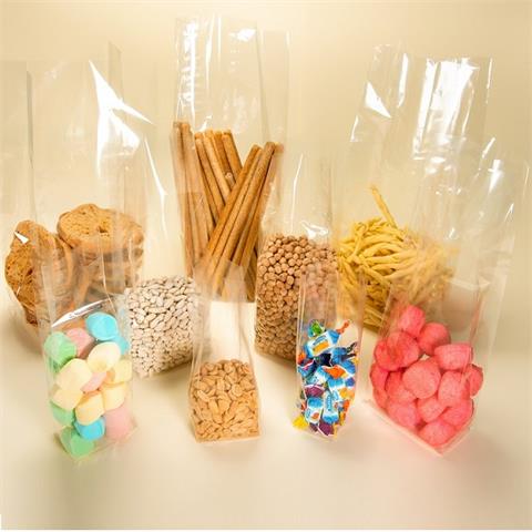 Sacchetti Royal in polipropilene laccati con soffietti laterali e con rinforzo in carta a fondo quadro Cm.6+5x20 sfusi, idonei al contatto alimentare. Ideali per il confezionamento di farina, pasta fresca, grissini, cereali, legumi, biscotti, caramelle, dolciumi e simili.
